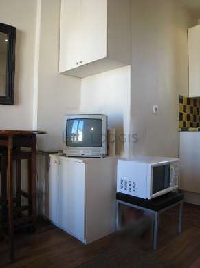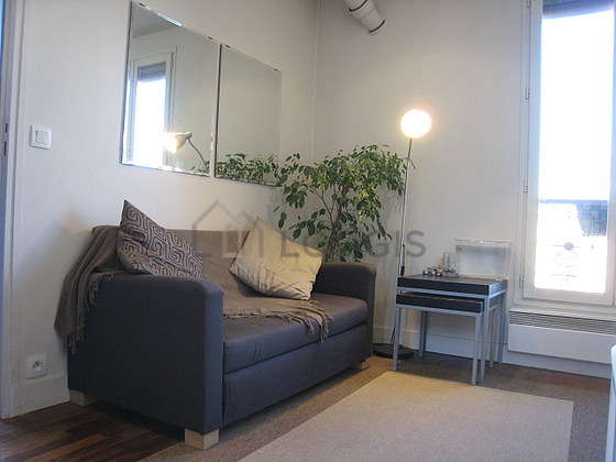 This apartment consists of a living room with wooden floor and its double-glazed windows and view on courtyard. This quiet living room is furnished and equipped for a comfortable stay: tv, sofa, dining table, coffee table, stool.