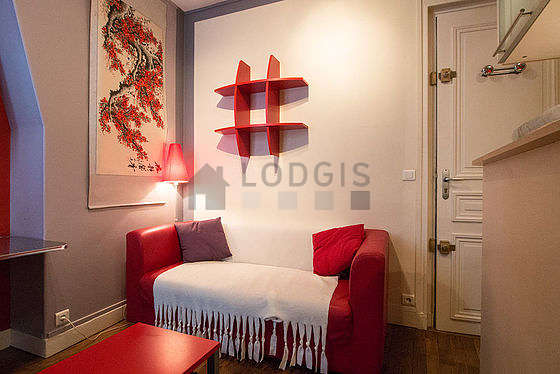 This apartment consists of a charming living room with wooden floor view on courtyard. This very quiet living room is furnished and equipped for a comfortable stay: tv, sofa, dining table, coffee table, 2 chair(s), stool.