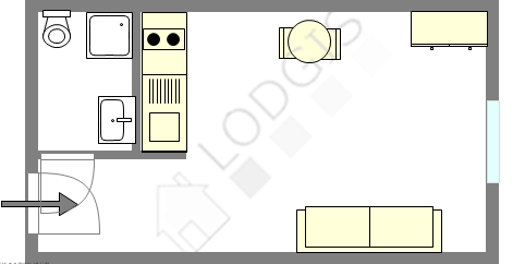This apartment consists of kitchen with wooden floor and all the necessary equipment for your daily life: hob, refrigerator, microwave oven, freezer, extractor hood, kettle, coffee-maker, cupboard, crockery.