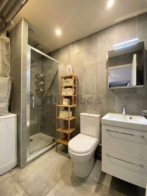 This duplex consists of a charming living room with wooden floor and its windows and view on courtyard. This very quiet living room is furnished and equipped for a comfortable stay: tv, sofa, 1 armchair(s), coffee table, sideboard.