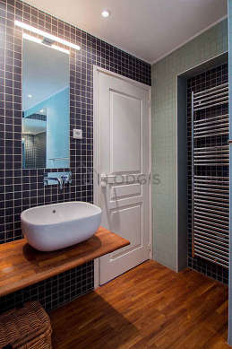 This apartment consists of beautiful kitchen close to the living room with wooden floor and all the essential equipment for your daily life: hob, refrigerator, oven, microwave oven, freezer, extractor hood, toaster, kettle, coffee-maker, shelves, cupboard, crockery.