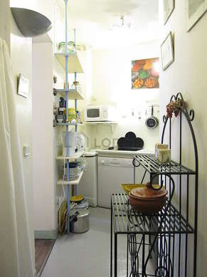 This apartment consists of a living room with wooden floor and its double-glazed windows and view on road. This quiet living room is furnished and equipped for a comfortable stay: tv, linen, quilt, refrigerator, sofa, 1 armchair(s), dining table, coffee table, desk, wardrobe, shelves, sideboard, crockery, 4 chair(s), airer, floor lamp, tv stand, mirror, coat stand, bin, painting, vase2 sofabed(s) of 120cm.