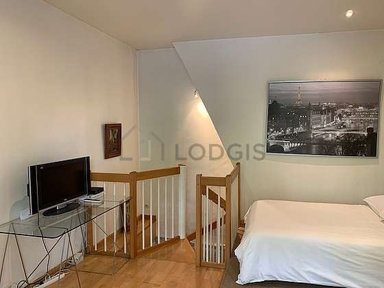 This duplex consists of a beautiful living room with wooden floor and its double-glazed windows and view on garden. This very quiet living room is furnished and equipped for a comfortable stay: tv, linen, quilt, 2 armchair(s), coffee table, desk, shelves, 1 chair(s), bedside table1 bed(s) of 120cm.