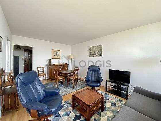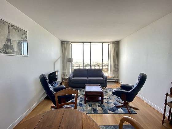 This apartment consists of a living room with wooden floor and its double-glazed windows with balcony. This living room is furnished and equipped for a comfortable stay: tv, sofa, 2 armchair(s), dining table, sideboard, 4 chair(s).