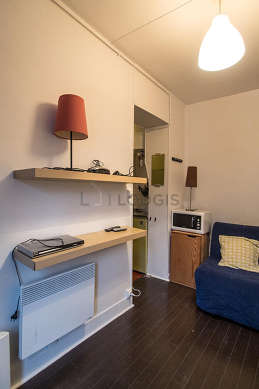 This apartment consists of a charming living room with wooden floor and its double-glazed windows with balcony and view on courtyard. This very quiet living room is furnished and equipped for a comfortable stay: linen, quilt, dining table, shelves, cupboard, 2 chair(s), stool1 sofabed(s) of 140cm.