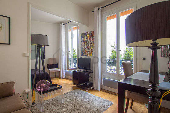 This apartment consists of a pleasant living room with wooden floor and its double-glazed windows and view on courtyard. This quiet living room is furnished and equipped for a comfortable stay: tv, linen, quilt, dining table, coffee table, desk, wardrobe, closet, cupboard, 2 chair(s), bedside table1 sofabed(s) of 120cm, 1 bed(s) of 140cm.