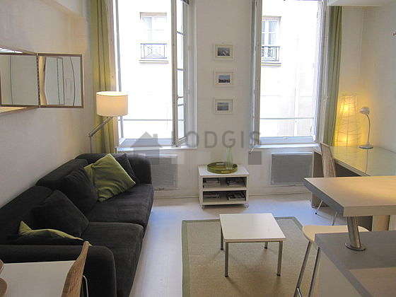 This apartment consists of a pleasant living room with wooden floor and its double-glazed windows and view on road. This quiet living room is furnished and equipped for a comfortable stay: tv, linen, quilt, dining table, coffee table, desk, wardrobe, shelves, cupboard, 2 chair(s)1 sofabed(s) of 140cm.