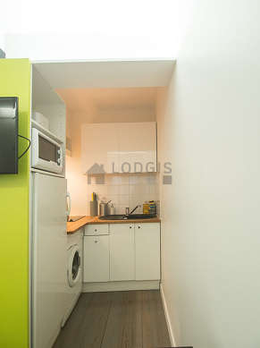 This apartment consists of beautiful kitchen close to the living room with wooden floor and all the necessary equipment for your daily life: hob, refrigerator, microwave oven, freezer, toaster, kettle, coffee-maker, cupboard, crockery, stool, bar.