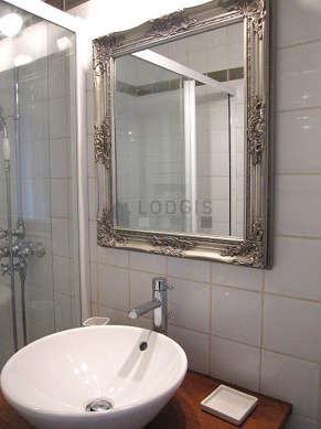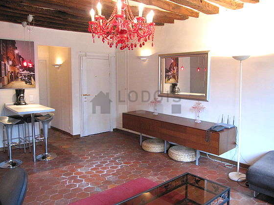 This apartment consists of a pleasant living room with a floor tiles floor and its double-glazed windows and view on road. This very quiet living room is furnished and equipped for a comfortable stay: tv, sofa, coffee table, desk, shelves, sideboard, cupboard, 2 chair(s).