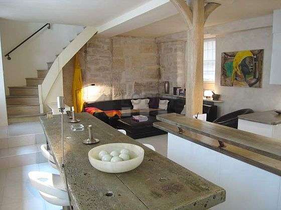 Living roomThis duplex consists of a fabulous living room with tile floor and its windows and view on courtyard. This very quiet living room is furnished and equipped for a comfortable stay: sofa, 1 armchair(s), dining table, coffee table, cupboard, stool.