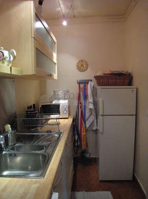 This apartment consists of beautiful kitchen with tile floor and all the necessary equipment for your daily life: hob, refrigerator, freezer, microwave oven, toaster, kettle, coffee-maker, shelves, cupboard, crockery.