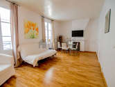 This apartment consists of a pleasant living room with wooden floor and its windows and view on courtyard. This very quiet living room is furnished and equipped for a comfortable stay: tv, linen, quilt, 1 armchair(s), dining table, coffee table, wardrobe, storage space, 4 chair(s)1 sofabed(s) of 160cm.