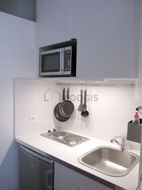 This apartment consists of a pleasant living room with wooden floor and its double-glazed windows and view on courtyard. This very quiet living room is furnished and equipped for a comfortable stay: tv, linen, quilt, dining table, desk, wardrobe, shelves, closet, 4 chair(s), bedside table2 bed(s) of 80cm.