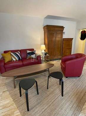 This duplex consists of a wonderful living room with marble floor and its double-glazed windows and view on courtyard. This very quiet living room is furnished and equipped for a comfortable stay: tv, sofa, 1 armchair(s), dining table, coffee table, wardrobe, shelves, storage space, sideboard, cupboard, crockery, 4 chair(s).