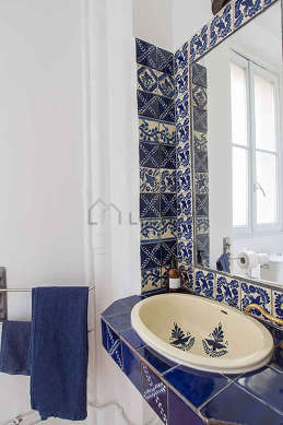 This apartment is equipped with a pleasant bathroom and bright with windows. This bathroom is furnished with all the equipment you need for a comfortable stay: bath towels, shelves, bath tub. The toilets are separated from the bathroom and located in an independant room.