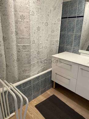This apartment is equipped with a pleasant bathroom. This bathroom is furnished with all the equipment you need for a comfortable stay: shelves, bath tub, airer, sink, mirror, coat stand, towel rack, carpet. The toilets are separated from the bathroom and located in an independant room.