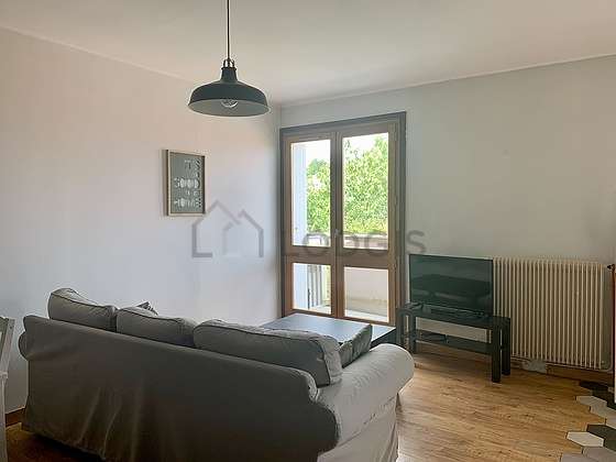 This apartment consists of a living room its windows. This living room is furnished and equipped for a comfortable stay.