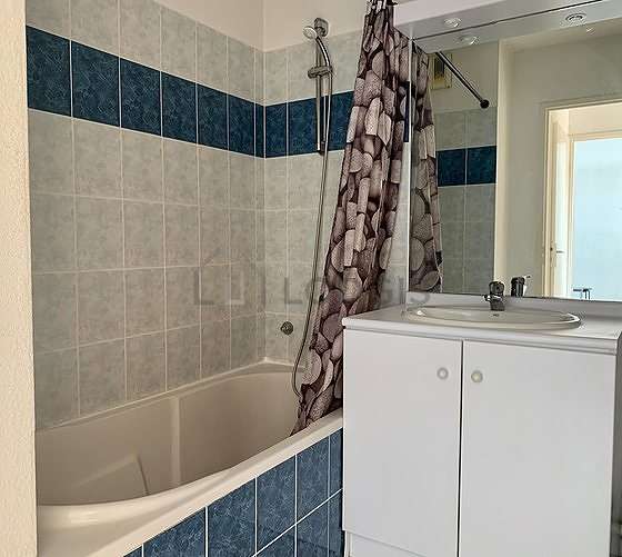 This apartment is equipped with a bathroom. This bathroom is furnished with all the equipment you need for a comfortable stay: cupboard, bath tub, sink, mirror, bin, curtains. The toilets are separated from the bathroom and located in an independant room.
