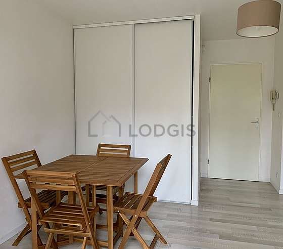 This apartment consists of kitchen close to the living room with wooden floor and all the necessary equipment for your daily life: hob, refrigerator, microwave oven, extractor hood, dining table, shelves, cupboard, crockery, 1 chair(s).