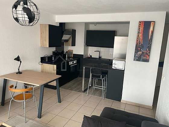 Este apartamento posee una magnífica cocina con parquet en el sueloy todo el equipamiento indispensable para su vida diaria : placas eléctricas, refrigerador, congelador, horno, micro ondas, campana extractora, tostador, cafetera, mesa, armario empotrado, vajilla, 2 silla(s), taburete, floor lamp, tv stand, bin.