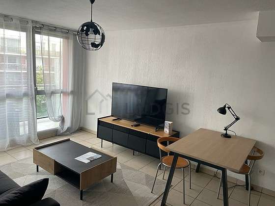 SalónEste apartamento está formado por un salón con azulejo en el suelo y ventanas doble acristalamiento. Este salón muy tanquilo está amueblado y equipado para que su estancia sea agradable : televisor, sábanas, sofá, mesa, mesita, mesa de estudio, vajilla, 2 silla(s), poster, airer, lamp, tv stand, bin, pouffe, curtains, painting, carpet.