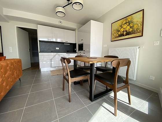 Este apartamento posee una magnífica cocina con azulejo en el sueloy todo el equipamiento indispensable para su vida diaria : placas eléctricas, refrigerador, congelador, horno micro-ondas, campana extractora, tostador, hervidor, cafetera, mesa, armario empotrado, vajilla, 4 silla(s).