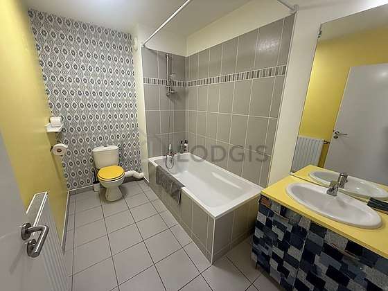 Este apartamento tiene una sala de baño magnífica y muy clara. Este baño tiene todo lo necesario para su bienestar diario : toallas, bañera, secador de pelo, sink, radiador seca-toallas. El WC está integrado en la sala del baño.