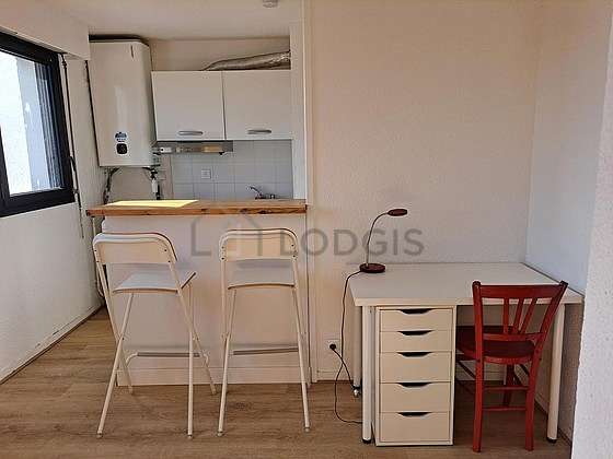 Este apartamento posee una magnífica cocina con parquet en el sueloy todo el equipamiento necesario para su vida diaria : placas eléctricas, refrigerador, campana extractora, mesa de estudio, estantería, vajilla, taburete, bin.