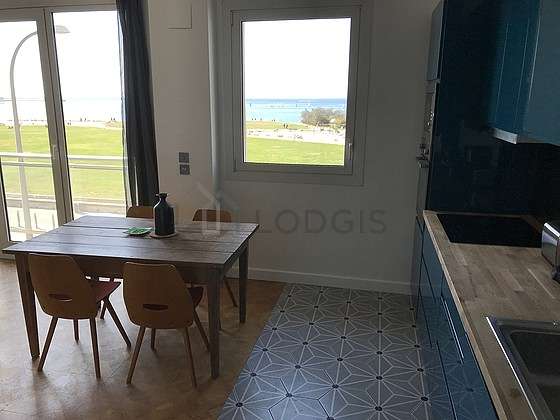 Este apartamento posee una magnífica cocina con azulejo en el sueloy todo el equipamiento indispensable para su vida diaria : placas eléctricas, refrigerador, congelador, horno, micro ondas, campana extractora, tostador, hervidor, cafetera, armario empotrado, vajilla.