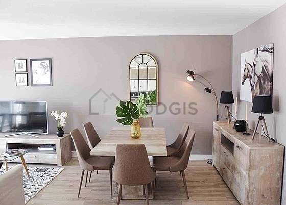 Este apartamento está formado por un salón con parquet en el suelo y ventanas. Este salón muy tanquilo está amueblado y equipado para que su estancia sea agradable : sofá, mesa, mesita, 1 silla(s).