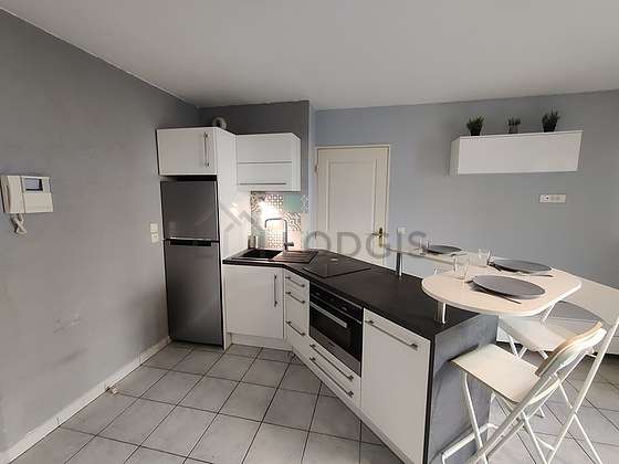 Este apartamento posee una cocinay todo el equipamiento esencial para su vida diaria : placas eléctricas, refrigerador, congelador, horno, mesa, armario empotrado, vajilla, taburete.