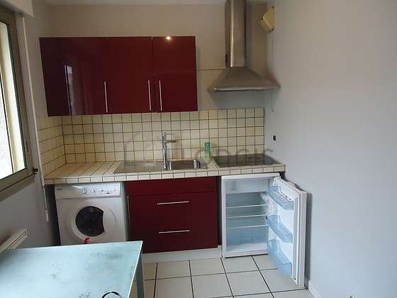 Este apartamento posee una cocinay todo el equipamiento esencial para su vida diaria : placas eléctricas, refrigerador, campana extractora, mesa.