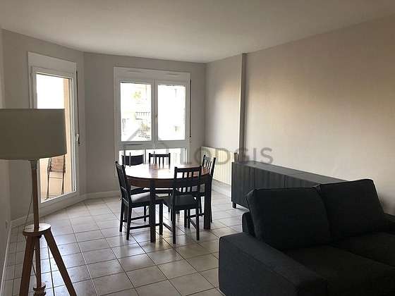 Este apartamento está formado por un salón con parquet en el suelo y ventanas doble acristalamiento, un balcon y una vista a al patio. Este salón está amueblado y equipado para que su estancia sea agradable : televisor, sofá, mesa, mesita, 1 silla(s), floor lamp.