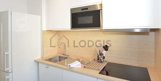 Este apartamento posee una cocinay todo el equipamiento necesario para su vida diaria : placas eléctricas, refrigerador, horno, micro ondas, campana extractora.