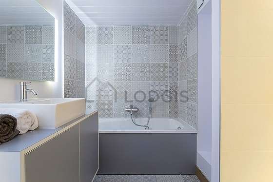 Este apartamento tiene una sala de baño. Este baño tiene todo lo necesario para su bienestar diario : armario empotrado, bañera, ducha, sink, radiador seca-toallas. El WC está integrado en la sala del baño.