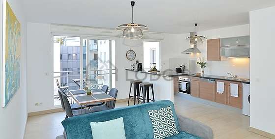 Este apartamento posee una cocinay todo el equipamiento esencial para su vida diaria : placas eléctricas, refrigerador, congelador, horno, micro ondas, campana extractora, cafetera, armario empotrado, vajilla, 1 silla(s), bar.