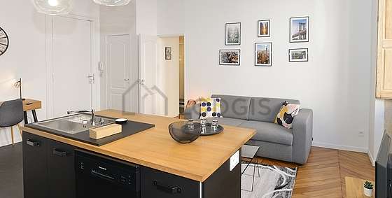 Este apartamento posee una cocina con parquet en el sueloy todo el equipamiento necesario para su vida diaria : placas eléctricas, refrigerador, congelador, horno, micro ondas, campana extractora, tostador, cafetera, vajilla, taburete, bar.