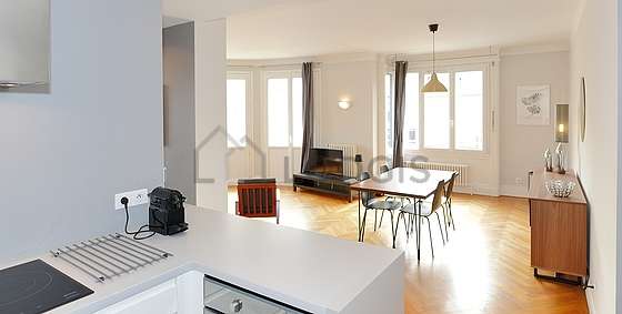 Este apartamento posee una cocinay todo el equipamiento necesario para su vida diaria : placas eléctricas, refrigerador, congelador, horno, micro ondas, campana extractora, tostador, cafetera, armario empotrado, vajilla, work surface.