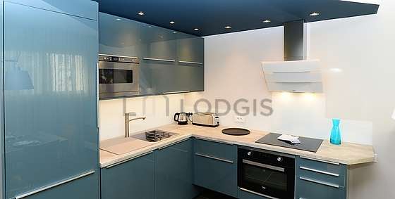 Este apartamento posee una cocinay todo el equipamiento esencial para su vida diaria : placas eléctricas, refrigerador, congelador, horno, micro ondas, campana extractora, tostador, hervidor, armario empotrado, vajilla.