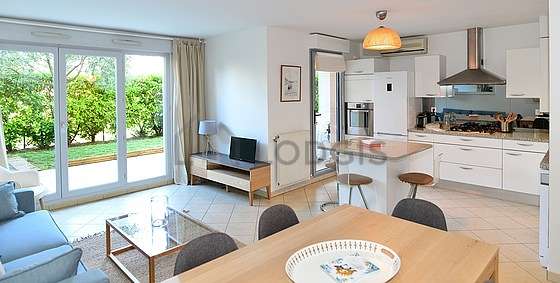 Este apartamento posee una cocinay todo el equipamiento indispensable para su vida diaria : placas eléctricas, refrigerador, congelador, horno, campana extractora, tostador, hervidor, armario empotrado, vajilla.