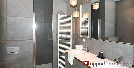 Este apartamento tiene una sala de baño. Este baño tiene todo lo necesario para su bienestar diario : toallas, ducha, secador de pelo, sink, mirror, towel rack, bin, radiador seca-toallas, ceiling light. El WC está integrado en la sala del baño.