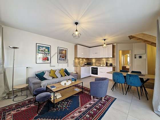 Este apartamento está formado por un salón ventanas doble acristalamiento. Este salón está amueblado y equipado para que su estancia sea agradable : televisor, sofá, mesa, mesita, vajilla, 4 silla(s).