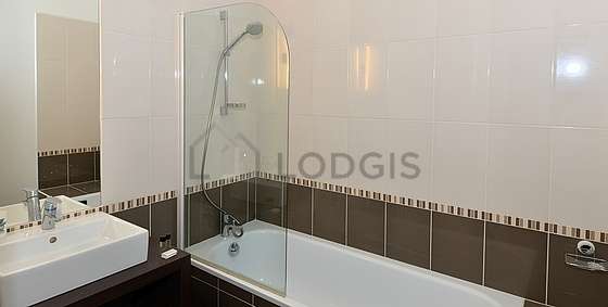 Este apartamento tiene una sala de baño. Este baño tiene todo lo necesario para su bienestar diario : armario empotrado, bañera, sink, radiador seca-toallas. El WC está separado de la sala del baño y ubicado en un espacio independiente.