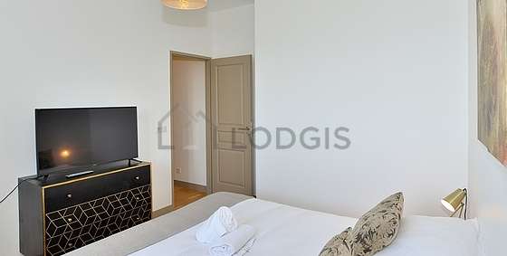 SalónEste apartamento está formado por un salón con parquet en el suelo y ventanas doble acristalamiento. Este salón muy tanquilo está amueblado y equipado para que su estancia sea agradable : televisor, sofá, 1 sillones, mesa, mesa de estudio, armario empotrado, 1 silla(s).