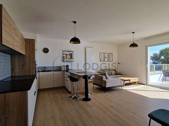 Este apartamento posee una cocina contiguo al salóny todo el equipamiento esencial para su vida diaria : placas eléctricas, refrigerador, congelador, horno, micro ondas, campana extractora, tostador, hervidor, cafetera, mesa, armario empotrado, vajilla, 1 silla(s).