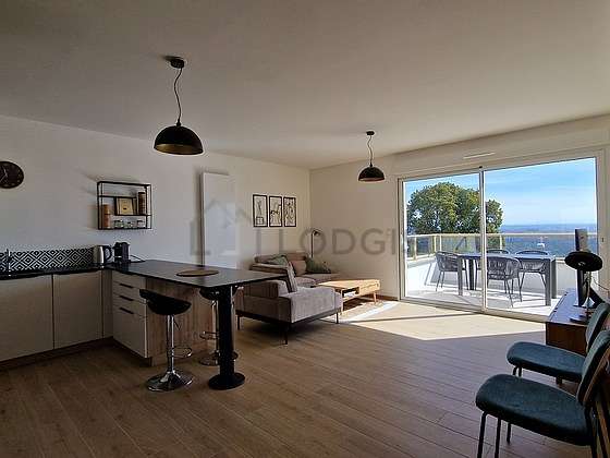 Este apartamento está formado por un salón ventanas doble acristalamiento. Este salón está amueblado y equipado para que su estancia sea agradable : televisor, sofá, mesa, mesita, cómoda, 1 silla(s).