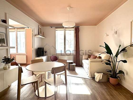 SalónEste apartamento está formado por un salón con parquet en el suelo y ventanas doble acristalamiento. Este salón está amueblado y equipado para que su estancia sea agradable : televisor, sofá, 1 sillones, mesa, mesita, estantería, 1 silla(s), tv stand.