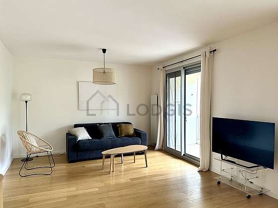 Este apartamento está formado por un salón con parquet en el suelo y ventanas doble acristalamiento, un balcon y una vista a jardín. Este salón muy tanquilo está amueblado y equipado para que su estancia sea agradable : televisor, sofá, 1 sillones, aparador, lamp, tv stand, curtains, blinds, painting.