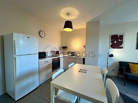 Este apartamento posee una cocinay todo el equipamiento necesario para su vida diaria : refrigerador, congelador, horno, micro ondas, mesa, armario empotrado, chopping board, work surface.