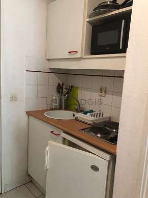 Este apartamento posee una cocina contiguo al salóny todo el equipamiento indispensable para su vida diaria : placas eléctricas, refrigerador, micro ondas.